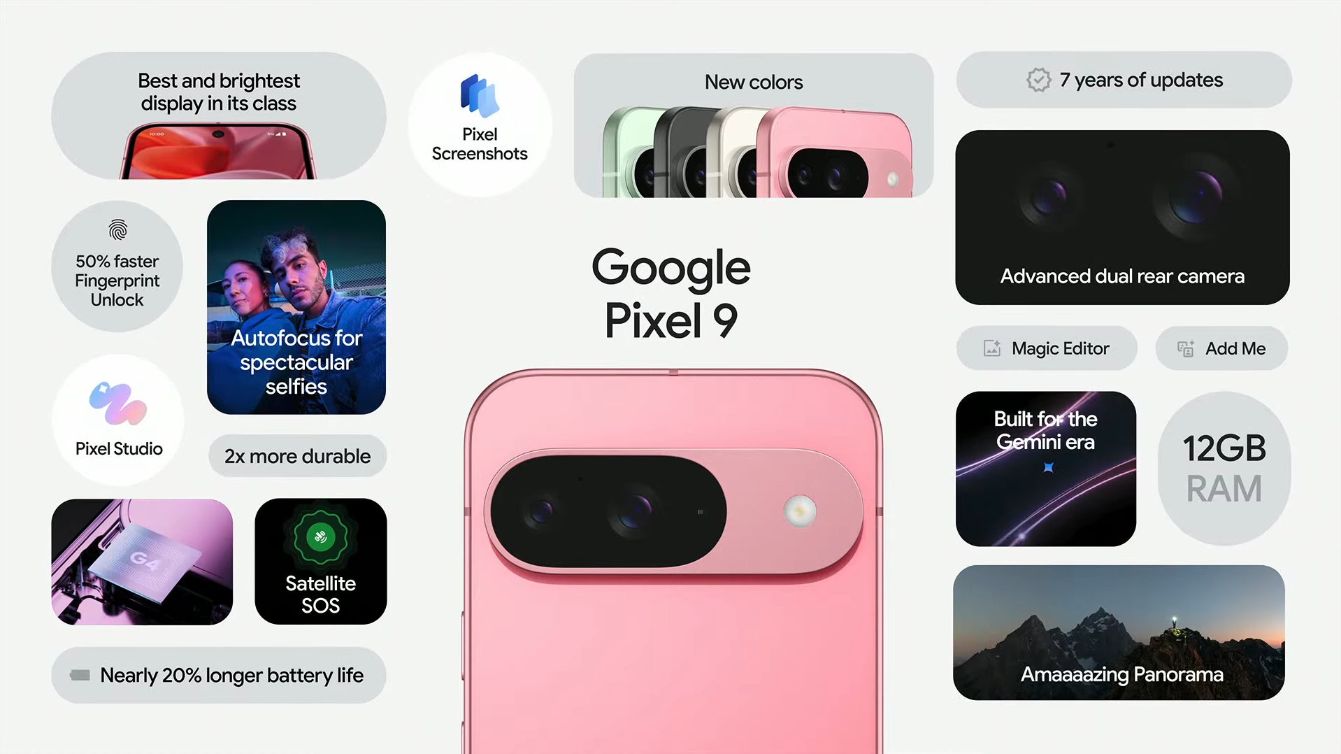 Pixel 9: It has a stunning 6.3' actua display with flat edges which is the first for a pixel. The new Pixel 9 series comes with a new under display ultra sonic fingerprint sensor and comes with the tensor G4 and 12GB of RAM
